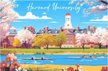 This postcard captures the timeless beauty of Harvard University in springtime. The scene features Harvard Yard in full bloom, with soft pink cherry blossoms framing classic red-brick buildings and the iconic clock tower rising against a bright blue sky. In the foreground, rowers glide across the Charles River.